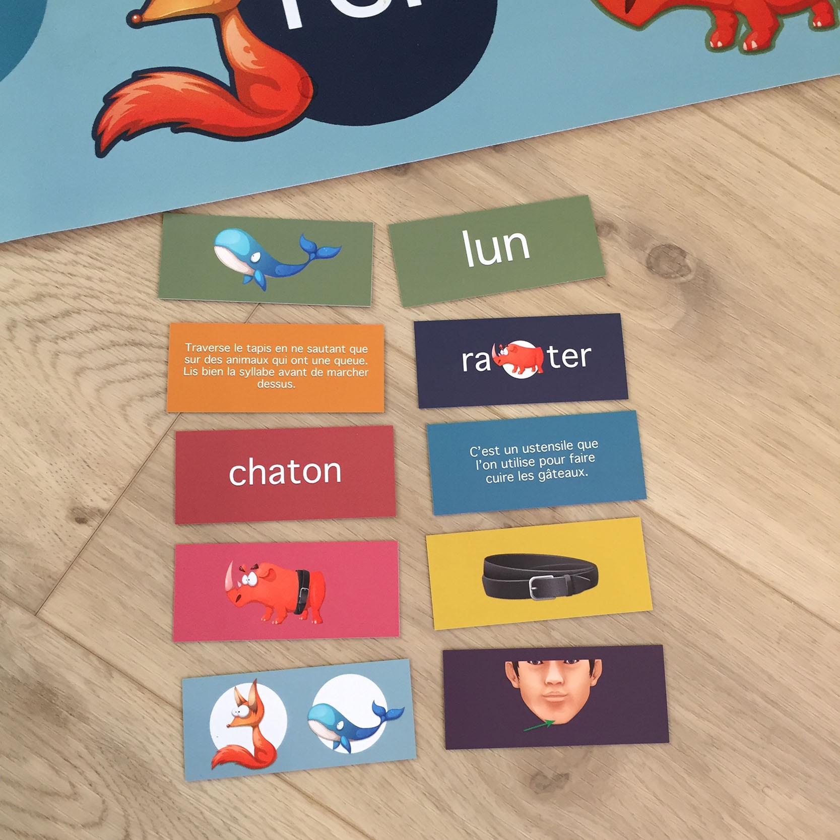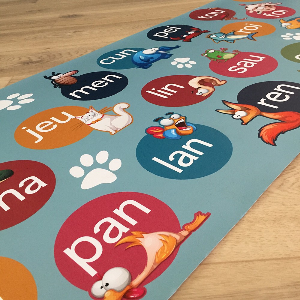 Ce matériel propose de travailler le codage/décodage de syllabes et de mots contenant des digraphes (au/ai/ei/ou/en/an/on/in/un/oi/eu) à l'aide d'un support ludique permettant une lecture "active". Il se compose d'un tapis grand format et de 128 cartes. Sur le tapis se trouvent 30 syllabes associées à un animal.