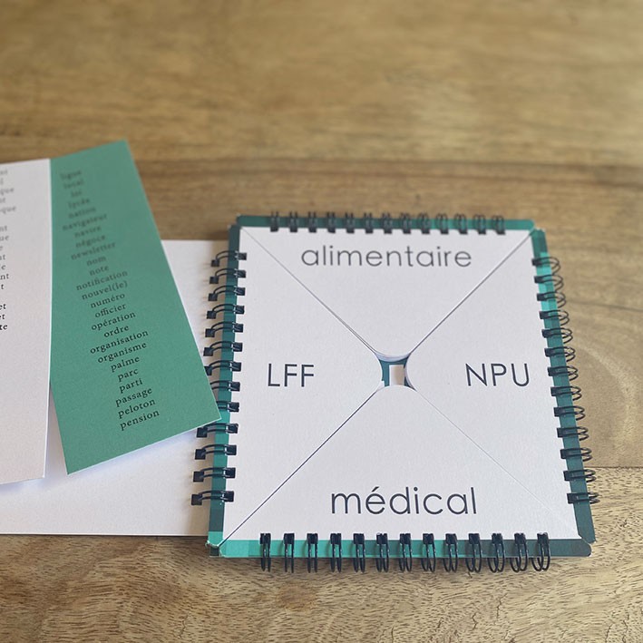 Mise en place: le livret spirale est placé devant le patient ou manipulé par le thérapeute. Le but du défi est de l’ouvrir en entier. A chaque tour de jeu, le patient doit choisir un thème et l’associer à un acronyme (par exemple alimentaire et JMA pourrait donner Journée Mondiale de l’Avocat). Si besoin, deux listes de mots rangés par ordre alphabétique sont fournies: