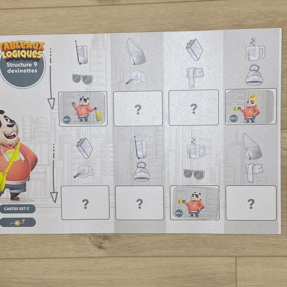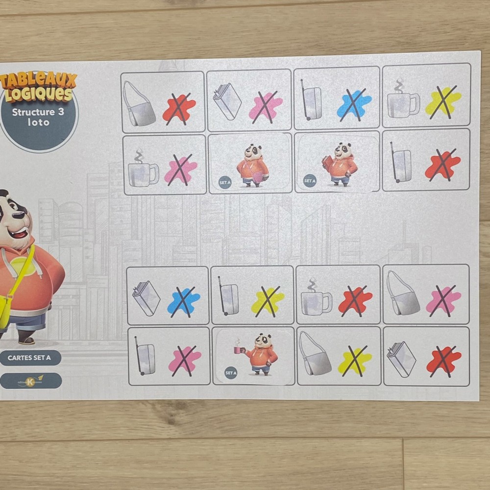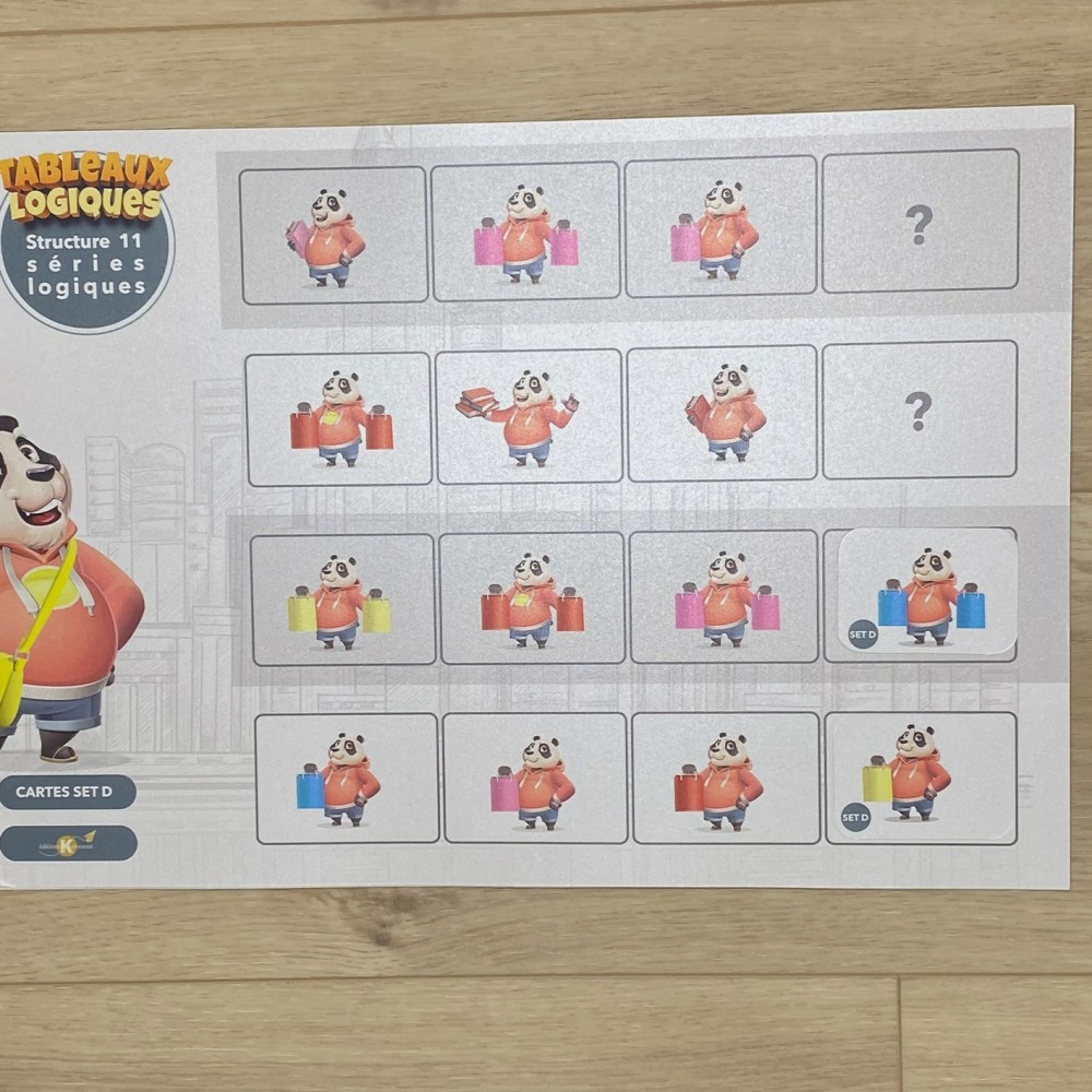 - 4ème étape: utilisation de la structure en comparaison avec les séries logiques. Le patient doit décrire les images et trouver le panda qui complète la série ou poser une carte consigne (set E à M) pour la continuer.