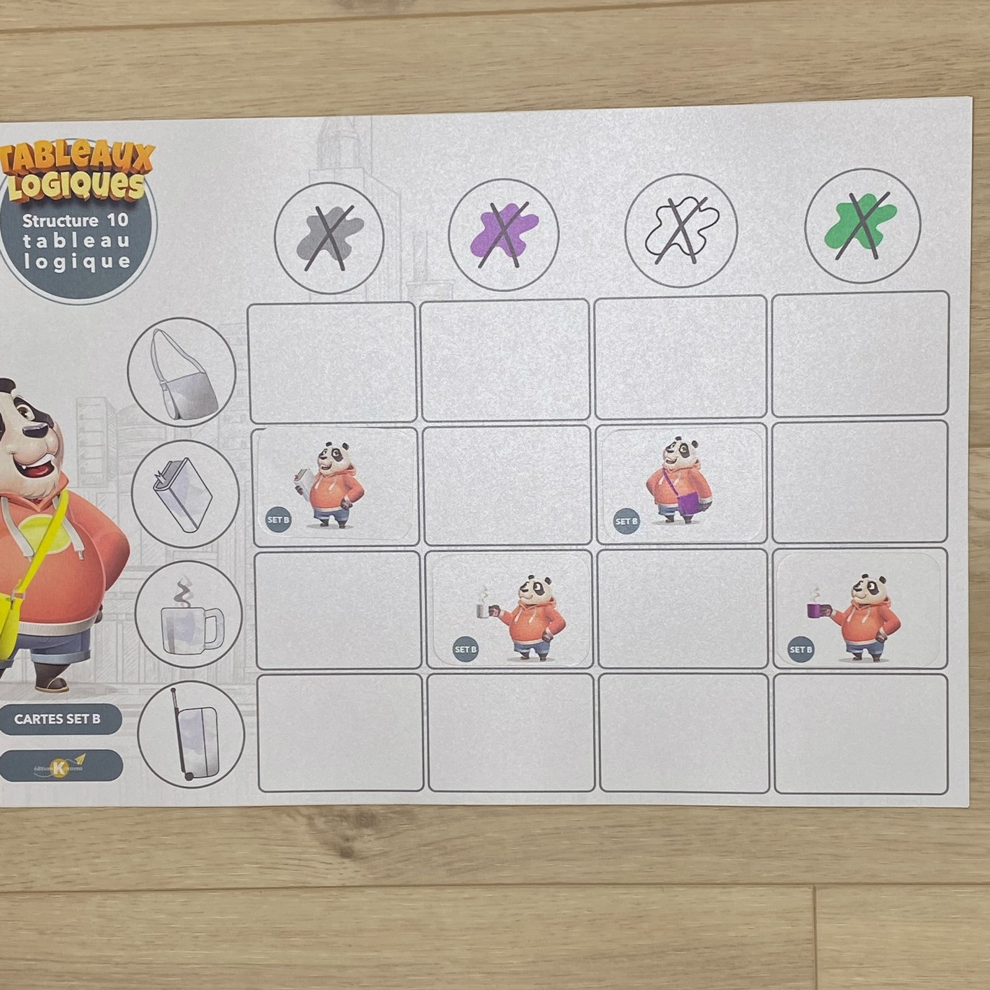 - 1ère étape: mise en place de la structure avec le tableau logique. Le patient a les cartes sous les yeux et le thérapeute indique une case dans le tableau en formulant la structure cible. Cette formule sera répétée pour remplir les seize cases du tableau.