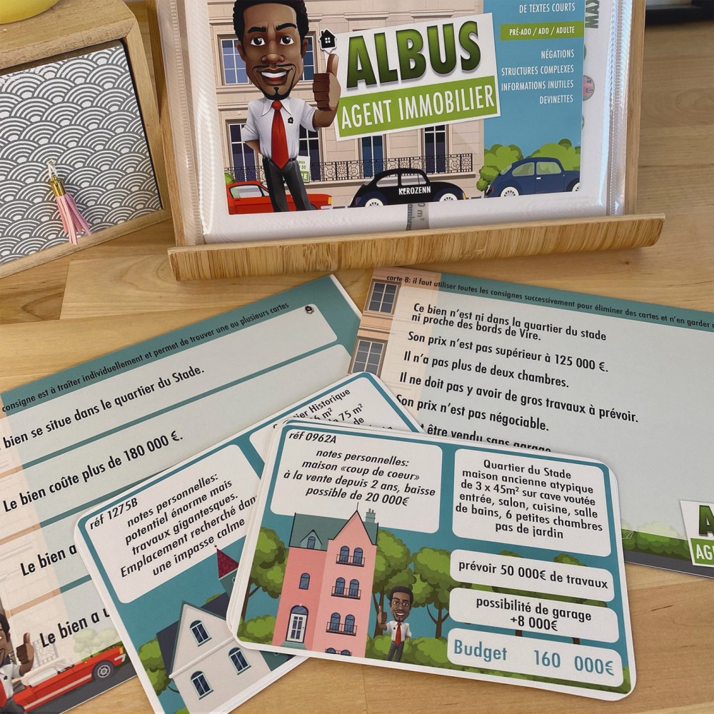 Albus l'agent immobilier permet de travailler la compréhension de textes courts avec des particularités syntaxiques et sémantiques ciblées. Chaque texte est construit autour d'un des quatre axes: négations, structures complexes, informations inutiles, inférences/devinettes.