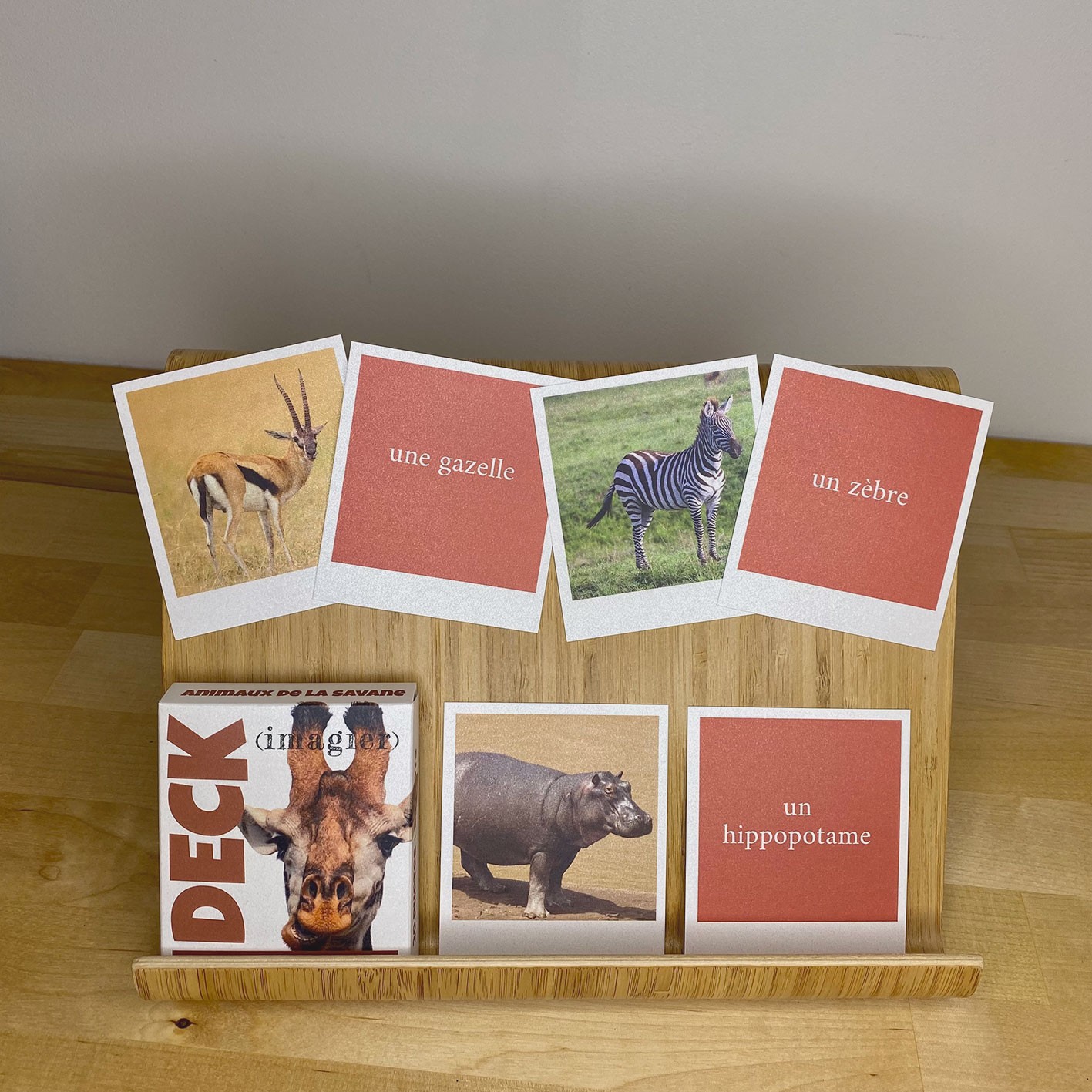 Deck est un jeu de cartes contenant 20 cartes images et 20 cartes mots/expressions/textes ainsi qu’une carte catégorie mot et une image. L'imagier "animaux de la savane" contient les cartes suivantes (mot et photo):