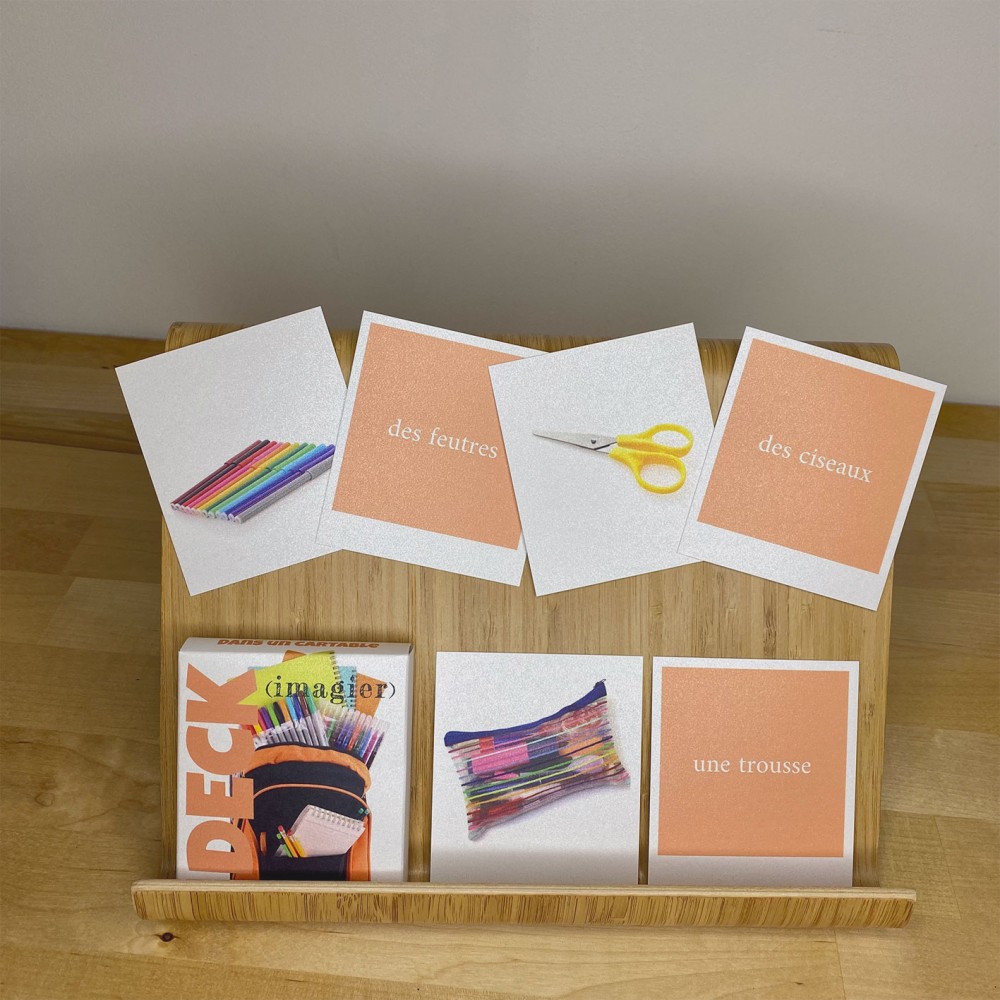 Deck est un jeu de cartes contenant 20 cartes images et 20 cartes mots/expressions/textes ainsi qu’une carte catégorie mot et une image. L'imagier "dans un cartable" contient les cartes suivantes (mot et photo):