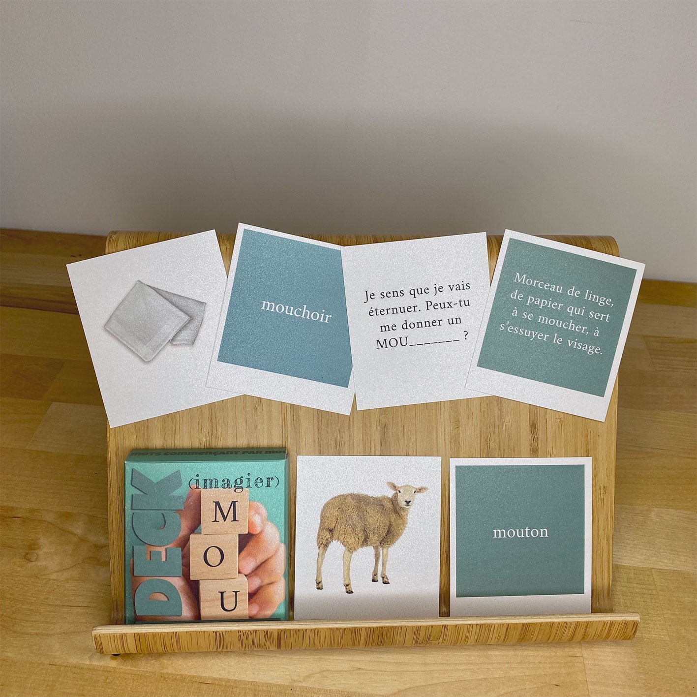 Imagier contenant 30 cartes mot / phrase, 10 cartes image et 2 cartes catégorie.