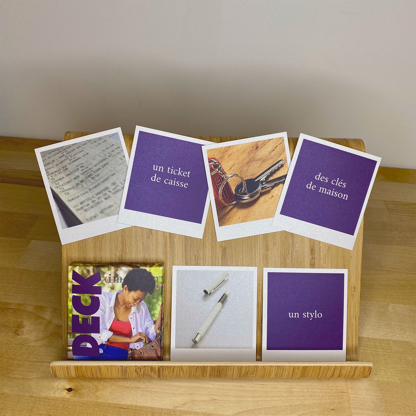 Deck est un jeu de cartes contenant 20 cartes images et 20 cartes mots/expressions/textes ainsi qu’une carte catégorie mot et une image. L'imagier "dans un sac à main" contient les cartes suivantes (mot et photo):