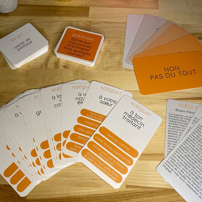 La cognition sociale est un domaine de notre pratique orthophonique. Il s’agit de l’adaptation des compétences sociales mais aussi discursives du patient en situation de communication. Les difficultés peuvent se rencontrer chez des patients présentant un trouble du spectre autistique, des troubles mentaux ou encore des maladies neurodégénératives,… La théorie de l’esprit est la base de ce type de rééducation. Cette théorie reprend les différents processus cognitifs qui permettent de s’adapter au monde mais aussi de comprendre les multiples mécanismes qui le constitue ainsi que ses propres états mentaux. Ce matériel a été conçu dans le but d’imaginer des situations de la vie quotidienne pour mettre le patient en situation afin qu’il puisse réguler son comportement et son discours. Il serait intéressant de pouvoir ensuite sortir du cadre de la rééducation pour amener le patient à vivre les différents jeux de rôle faits en séance. Pour aller plus loin sur le sujet, l’Inserm de Caen a une unité qui publie beaucoup sur le sujet et quelques mémoires en orthophonie ont également été effectués.