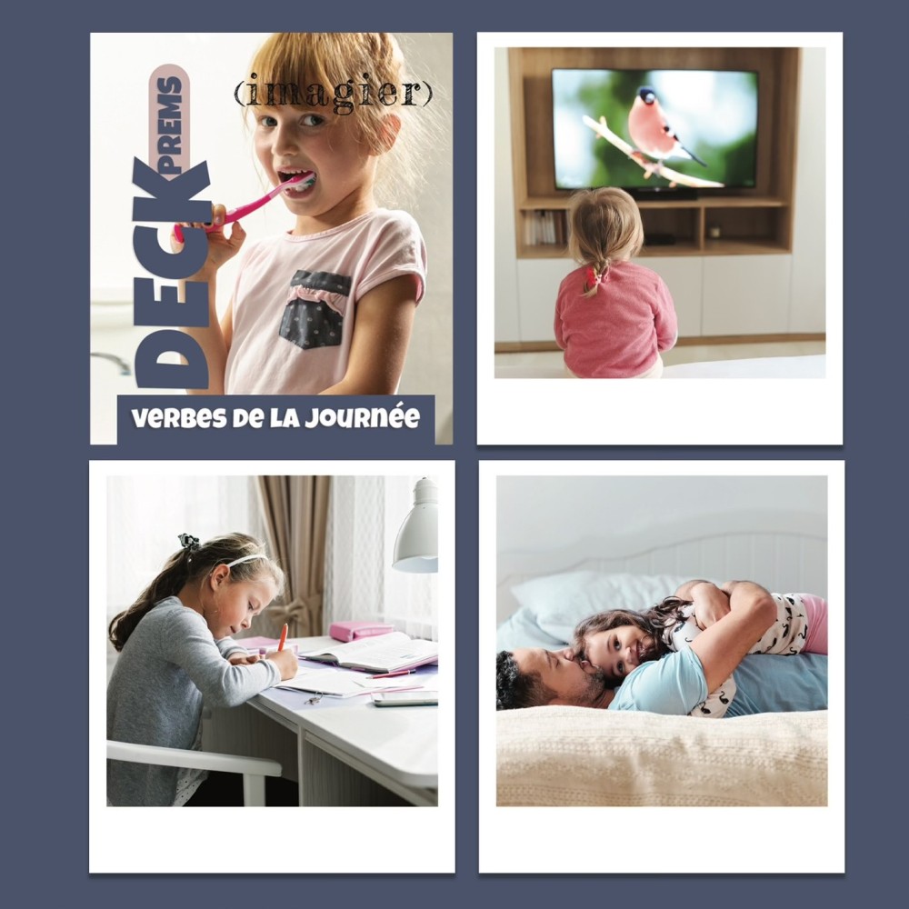 Contenu: dormir, petit-déjeuner, aller aux toilettes, se brosser les dents, s'habiller, se coiffer, aller à l'école, travailler en classe, manger à la cantine, sortir de l'école, goûter, faire du sport, faire ses devoirs, jouer, regarder la télévision, se déshabiller, se doucher, dîner, faire un câlin, écouter une histoire
