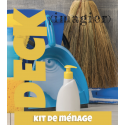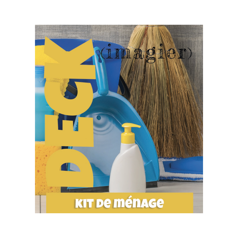 un aspirateur, un balai, une éponge, des gants, du gel WC, de la lessive, une lingette microfibre, du liquide de rinçage, un balai serpillère, un nettoyeur vapeur, un panier à linge, une pelle et une balayette, un plumeau, du produit à vitres, du produit vaisselle, une raclette à vitres, un sac poubelle, une pastille lave-vaisselle, une brosse à toilettes, un robot aspirateur