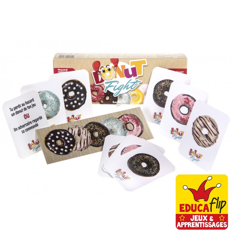 Modalité de jeu: les joueurs mémorisent leur carte commande et reçoivent les cartes donut. A chaque tour de jeu, quatre possibilités: piocher un donut ou une carte chance (qui implique un choix stratégique d'attaque ou de défense), passer son tour pour rafraichir sa mémoire (et regarder sa commande). Enfin, il est possible de récupérer le donut rejeté par le joueur précédent. Le premier à compléter sa commande est sacré vainqueur.Plusieurs modalités de jeu sont proposées : mode match, mémory, mistigri, devinette, pokernut).Ce matériel comprend: